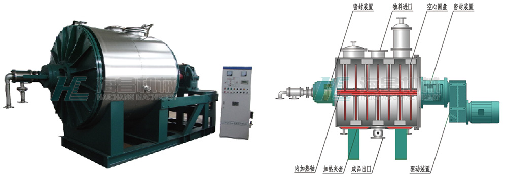 眾所周知,我國(guó)目前正在生產(chǎn)和使用的干燥設(shè)備品種繁多,如噴霧干燥機(jī)、流化床干燥機(jī)、氣流干燥機(jī)、耙式真空干燥機(jī)、雙錐回轉(zhuǎn)真空干燥機(jī)、犁刀式真空干燥機(jī)等。這些設(shè)備大多存在著能耗高、熱效率低、干燥周期長(zhǎng)等缺點(diǎn)。為了解決上述問(wèn)題,我公司研制了這款臥式圓盤(pán)(螺帶)干燥機(jī)。